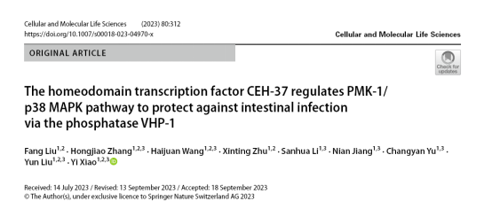 为第一单位在国际知名期刊《Cellular and Molecular Life Sciences》(IF:8.0,中科院1区Top期刊)在线发表了题为“The homeodomain transcription factor CEH-37 regulates PMK-1/p38 MAPK pathway to protect against intestinal infectionvia the phosphatase VHP-1”的研究论文。2048核基地