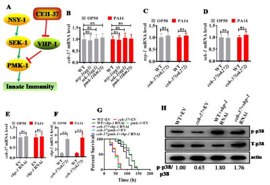 越来越多的证据表明,防御基因在正确的时间和地点的表达受宿主防御转录因子的调控。然而,这种调节的确切机制尚不清楚。同源域转录因子由同源盒基因编码,在多细胞真核生物的发育过程中起着至关重要的作用。在这项研究中证明了同源结构域转录因子CEH-37(在哺乳动物中称为OTX2)是秀丽隐杆线虫宿主防御的关键转录因子。同时,CEH-37在肠道中起保护秀丽隐杆线虫免受病原体感染的作用。进一步研究发现同源结构域转录因子CEH-37通过抑制磷酸酶VHP-1正调控PMK-1/ p38 MAPK活性,促进肠道免疫。此外,该研究证明了这种功能是保守的,因为在铜绿假单胞菌感染期间,人同源结构域转录因子OTX2在肺上皮细胞中也表现出保护功能。因此,该研究表明CEH-37/OTX2是一种进化上保守的防御病原体感染的转录因子。这一发现提供了一个新的作用模式:CEH-37降低磷酸酶VHP-1的活性,导致肠道中PMK-1/p38 MAPK磷酸化级联的增加,从而对病原体产生抗性。